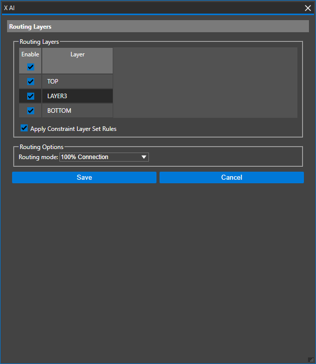 - 100% connection: Connect all signal nets. Note this may result in DRCs/shorts